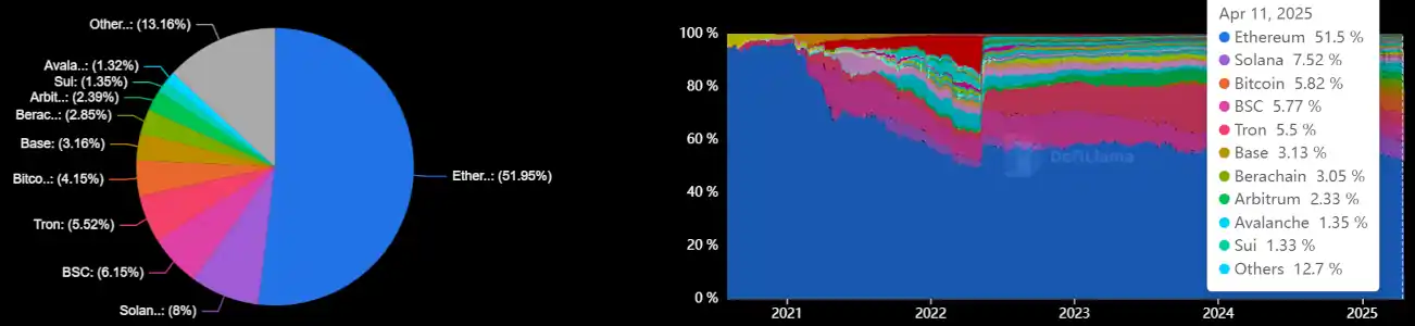 Currently, the most commonly used metric to compare the scale of DeFi is TVL (Total Value Locked). According to data from DefiLlama, Ethereum still dominates the market, accounting for nearly 52% of the total. The remaining 48% is also largely comprised of EVM-compatible chains. Moreover, most DeFi protocols on EVM chains support MetaMask, which means that through the MetaMask wallet, you can access and experience the vast majority of the DeFi world.